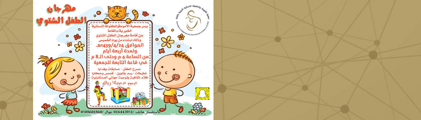 مهرجان الطفل الشتوي 1439هـ من منطلق استثمار أوقات الفراغ واستغلال إجازة ما بين الترمين أقامت جمعية الأمومة والطفولة النسائية الخيرية بالغاط مهرجان الطفل الشتوي والذي أقيم في صالة التابعة للجمعية ابتداءً من يوم الاحد الموافق 27/4/1439هـ ولمدة أربعة أيام من الساعة الرابعة مساءً وحتى الثامنة مساءً الهدف منها : استثمار أوقات الفراغ للأطفال. تنميه المهارات […]
