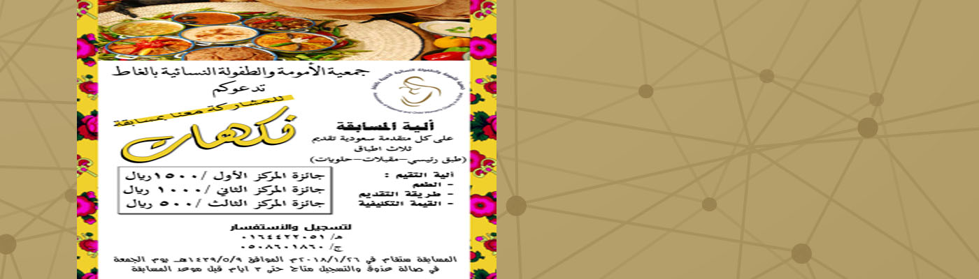 تعتزم جمعية الأمومة و الطفولة النسائية الخيرية بالغاط اليوم 6_9_1440هـ الموافق 12_5_2019 وحتى الغد اقامة فعالية إيفنت ليالي الخير و المقام في “استراحة الساحة” بدأً من الساعة العاشرة مساءً إالى الساعة الواحدة صباحاً حيث تتضمن محاضرة توعوية بالإضافة إلى المسابقات و الأسئلة الدينية وغيرها من الفعاليات في أجواء روحانية خاصة بـ ليالي رمضان .