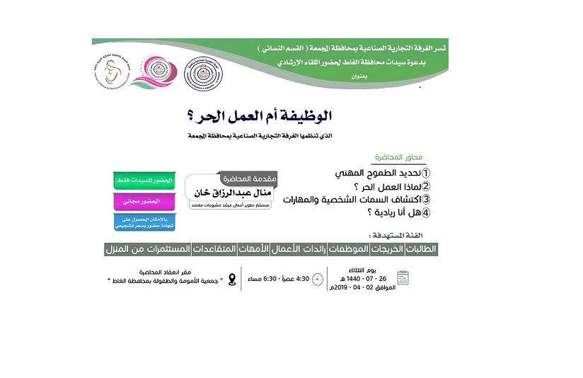 أعلنت جمعية الأمومة و الطفولة النسائية الخيرية بمحافظة الغاط انه بالتعاون وبالتنسيق مع الغرفة التجارية الصناعية بمحافظة المجمعة ممثلة باللجنة النسائية بالغرفة فقد تقرر إقامة جلسة ارشادية و محاضرة نسائية بعنوان (الوظيفة أم العمل الحر ) حيث سيتم انعقاد البرنامج في مقر جمعية الأمومة و الطفولة النسائية الخيرية بمحافظة الغاط و ذلك يوم الثلاثاء 27_7_1440هـ […]
